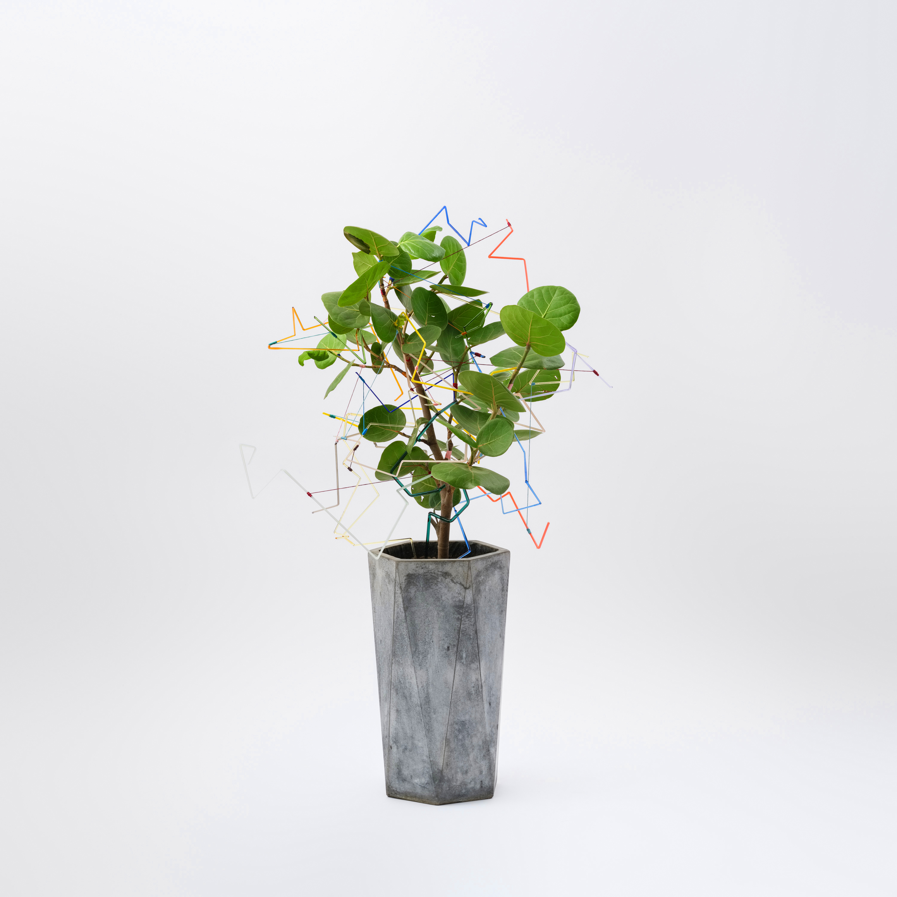 也因為這樣的念頭觸發了我想創作一件結合隨處可見的盆栽與塗畫(Drawing)般的玻璃物件的全新作品,在這件作品中試著去營造出可由多重視角觀賞的植物與塗畫物件相結合的裝置作品。乍看之下,人為創作的部分像是違反自然原則而所造的盆景塗畫,但我想像隨著時間的流逝,生長其中的植物漸漸生長,終將與人工堆砌的玻璃塗畫物件日益融合、彼此共存,形成一道人工與自然相互對話的景致。