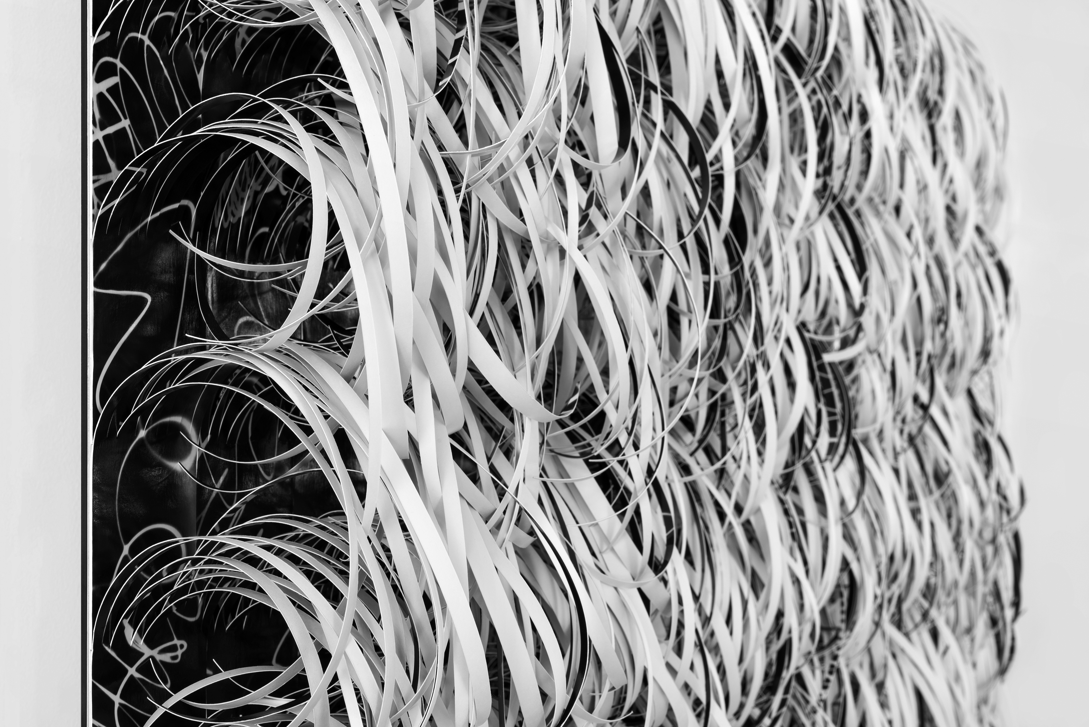 In 2020, I began integrating various series of my works. I adopted the old photographic technique of "photogram," also known as "light drawing". The piece "Aura: The backside of springs" is a photo-sculpture combining several black and white silver gelatin prints of springs. I rolled the side with the images inward to echo the curved form of the piece. I find it intriguing when viewers have to peek through the gaps to see the images, as it presents a challenge to them.