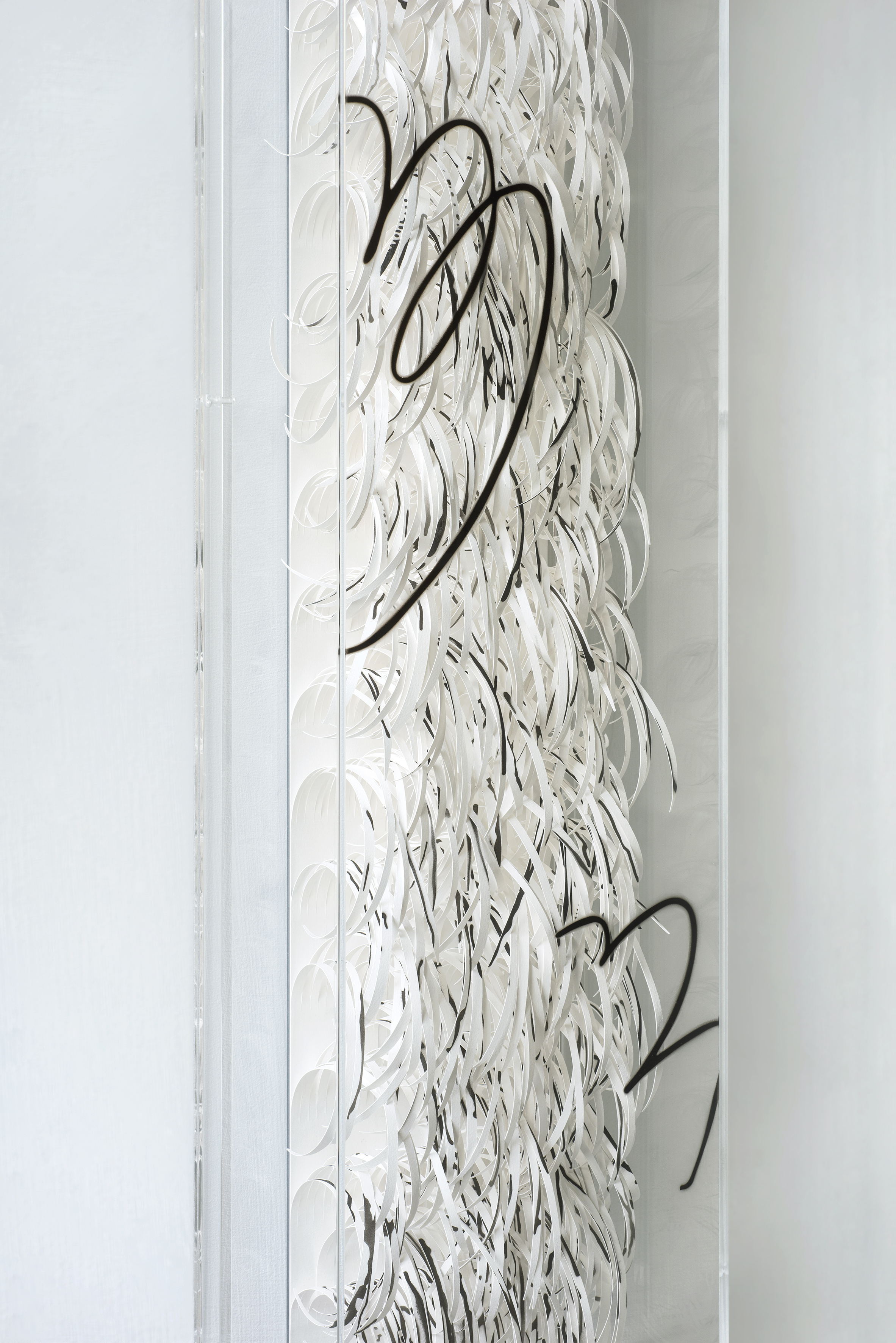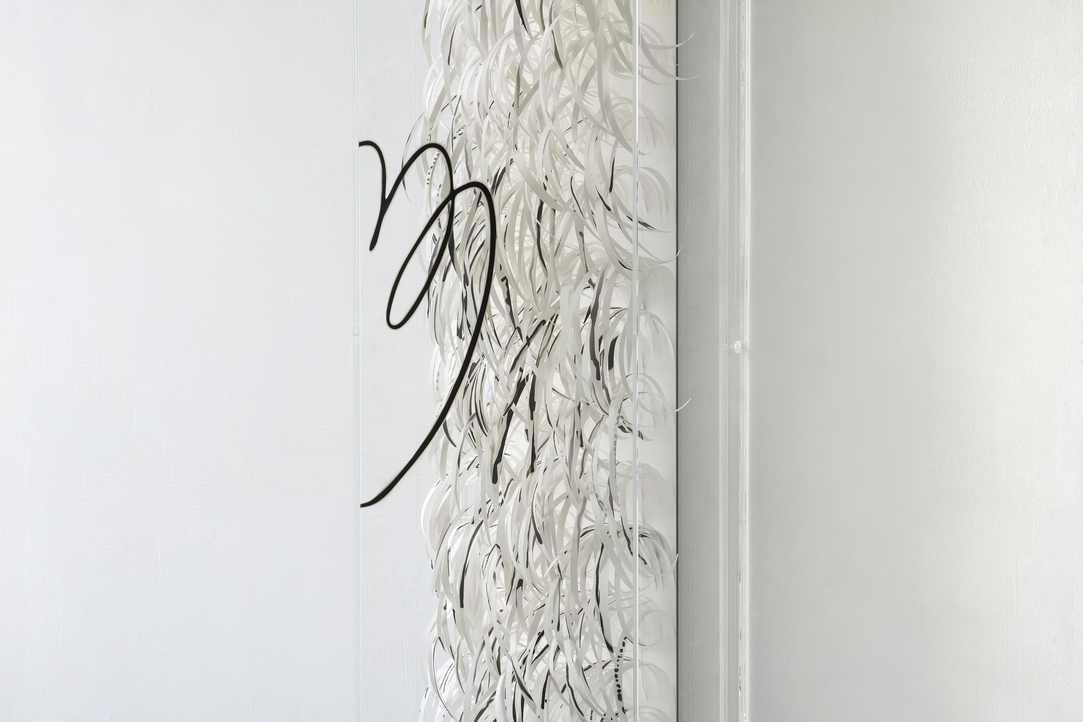 These three pieces attempt to blur the relationship between drawing and text, creating a state of overlapping in space. Through this form, they articulate a perception of the world that is more liberated.